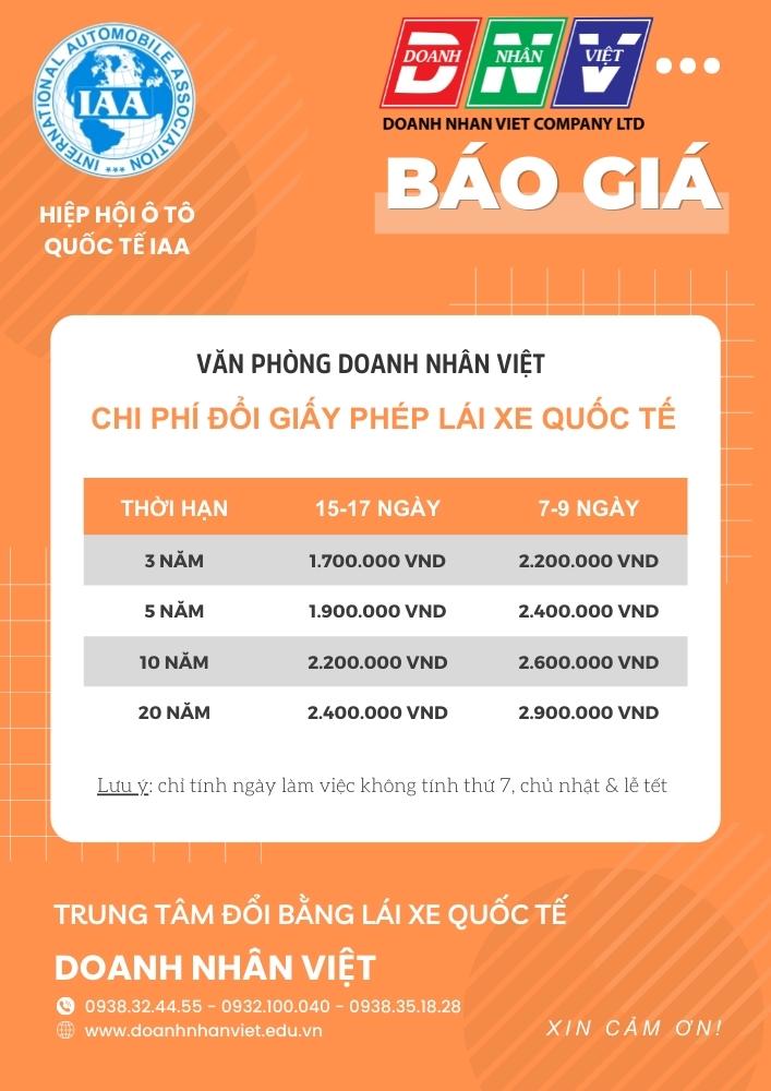 Văn phòng Doanh Nhân Việt xin gửi đến Quý Anh/ Chị và các bạn bảng báo giá chi tiết chi phí đổi bằng lái xe quốc tế IAA ở thời điểm hiện tại.